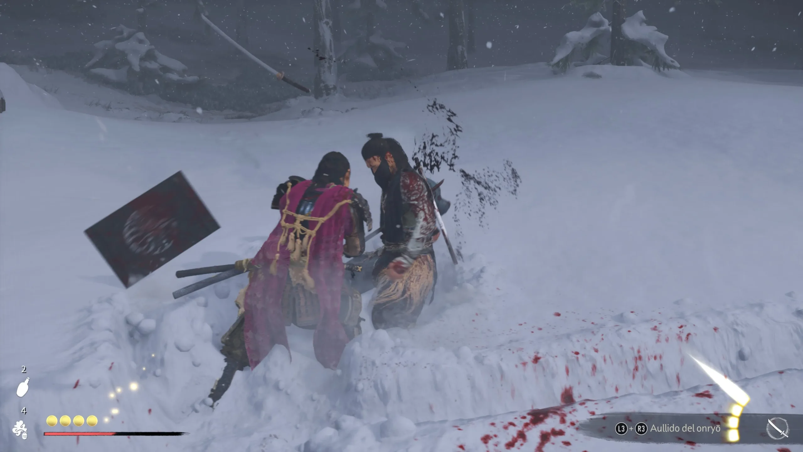 A las ya conocidas espadas, se unirán las armas a distancia, que tienen una acción para ralentizar el tiempo. Contaremos con un fusil de mecha, que será letal una vez se cargue y también otros accesorios menores como los kunais o las bombas de humo. Hay que tener en cuenta que durante el combate aparecerán indicadores para avisarnos que un ataque nos va a desarmar, así que si veis el color amarillo, esquivadlo o mantened pulsado el botón triángulo para asestar un golpe antes.