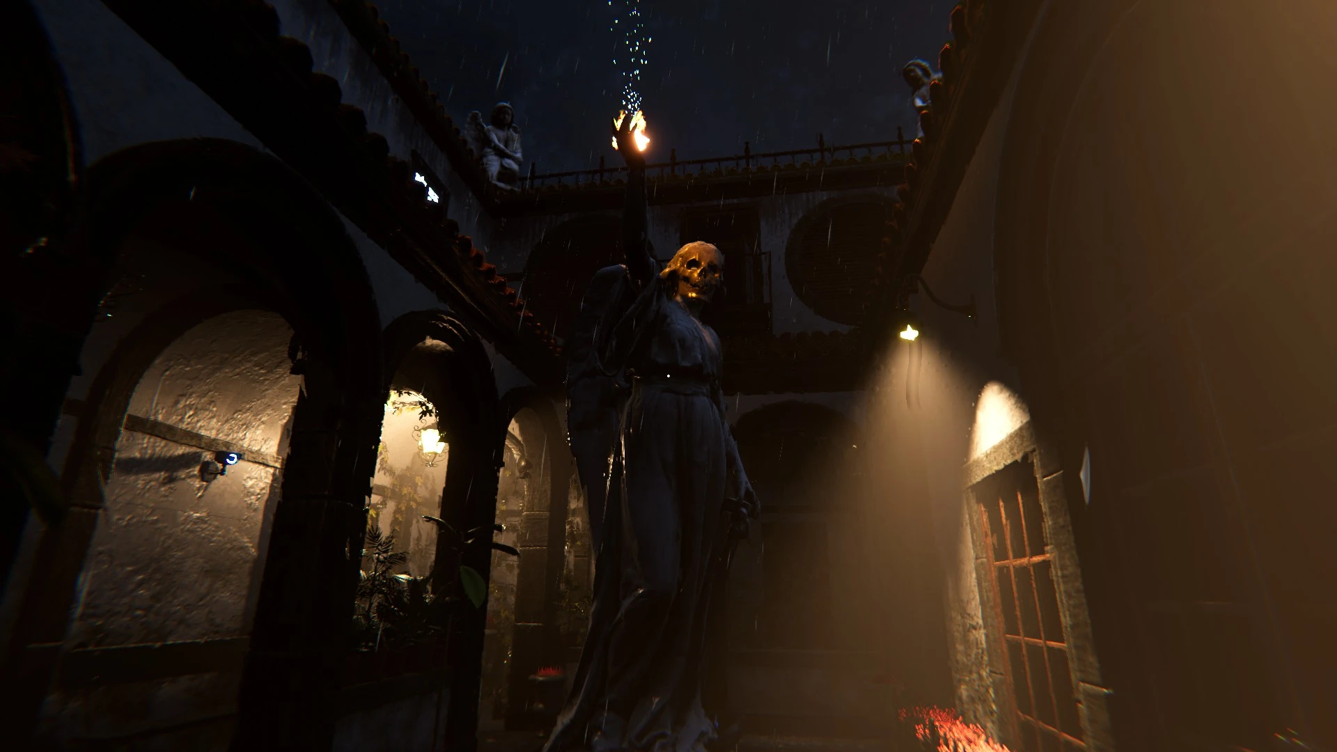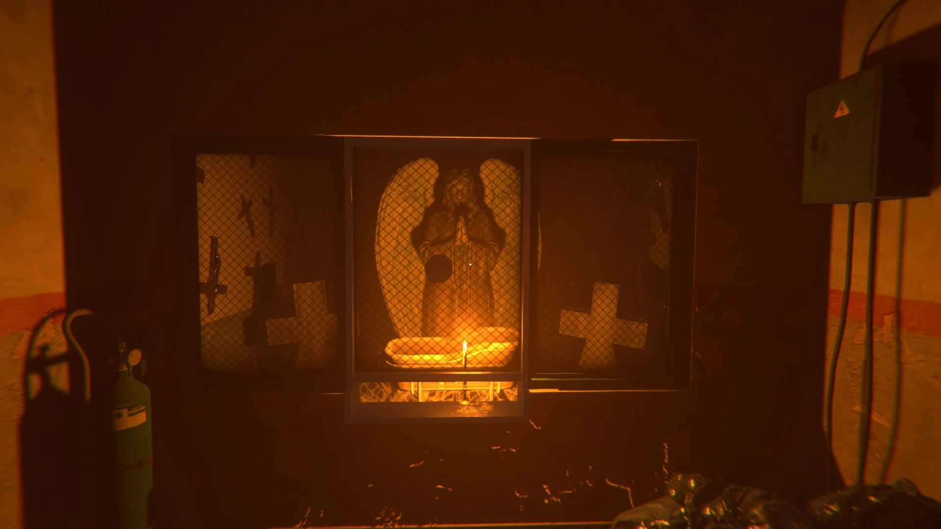 Las texturas y el modelado transmiten una decadencia palpable, aunque se percibe cierta repetición de assets y efectos de partículas algo toscos que delatan su origen independiente. De hecho, hay un detalle curioso: algunas partículas pueden confundirse con objetos interactuables, lo que afecta momentáneamente a la jugabilidad y genera pequeñas frustraciones durante la exploración. Aun así, el conjunto se mantiene coherente, atmosférico y simbólico. Cada luz, cada reflejo, parece colocado con intención, reforzando la sensación de estar atrapado entre dos mundos: el físico y el espiritual. El resultado es un infierno doméstico, donde lo sobrenatural se manifiesta a través de lo cotidiano: una iglesia cerrada, una estatua oxidada, un televisor que parpadea sin señal.