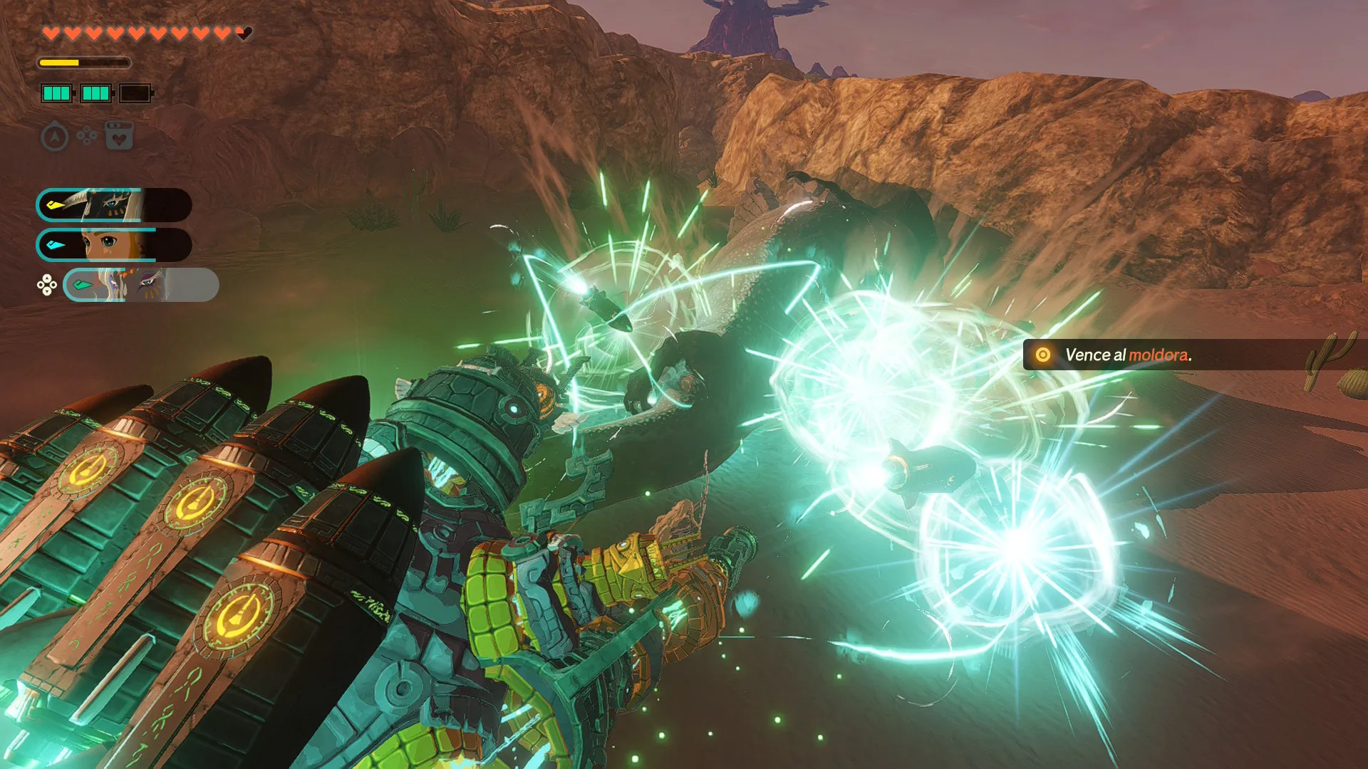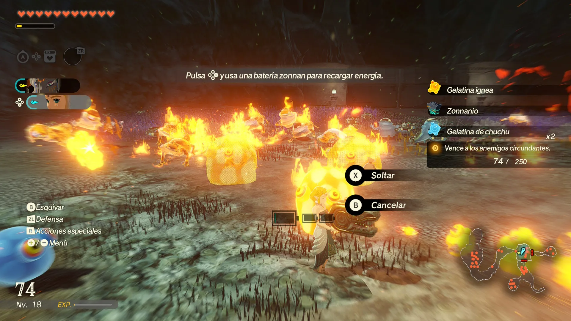 Aparte, también podremos usar las baterías Zonnan para usar los diferentes artefactos Zonnan que ya vimos en TOTK; como las bombas, los igneocéfalos o los criocéfalos (hay muchos más pero no queremos romper la magia de descubrirlos). Cabe decir que el uso de artilugios Zonnan, y al igual que en TOTK, tendrán su mayor o menor impacto dependiendo del entorno donde los usemos; por poner un ejemplo, los criocéfalos son más efectivos si los enemigos están pisando un charco; como podéis ver, el origen elemental del ataque se ha cuidado mucho en este juego.