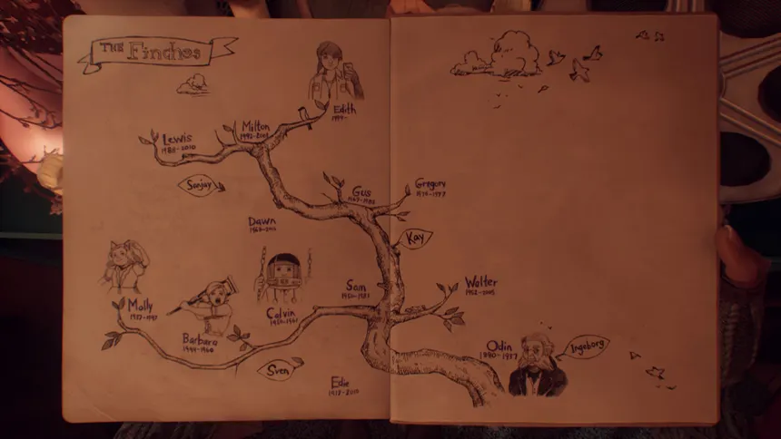 Edith Finch, la última de su estirpe, regresa al hogar familiar no par a habitarlo, sino para despedirse de él. Su voz, que guía al jugador, no es solo una narradora: es una testigo que busca reconciliarse con el peso de la historia. A medida que recorre la casa, escribe un diario que se convierte en carta póstuma para su hijo. El gesto de narrar, de poner los miedos en palabras, es su forma de romper el ciclo.