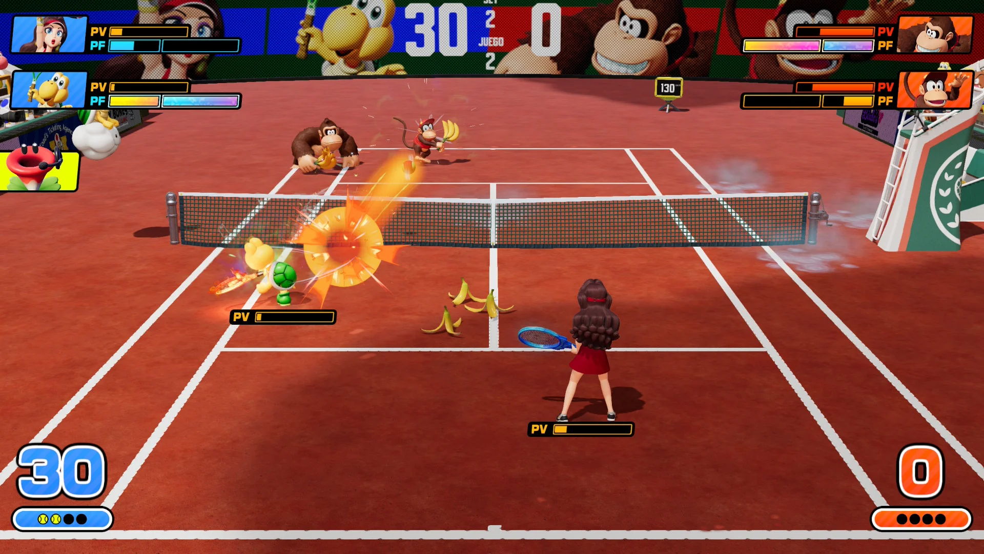 Entrando en materia y para que vayáis entendiendo de qué va el asunto, en esta entrega nuestro personaje tiene una barra de vida así como una barra de furor. A medida que golpeamos la pelota, la barra furor se va rellenando. Cuando ésta está llena, pulsando un botón desataremos un ataque furor; un ataque que, de conseguir que la pelota bote en el suelo rival, desatará un efecto que variará dependiendo de la naturaleza de la raqueta. Ejemplos de ellos van desde que aparezcan charcos de hielo que congelen por contacto al enemigo, a barro que ralentice el movimiento del jugador, unos tornados que desplacen la pelota o incluso que aparezca un doble que nos ayude durante unos instantes.