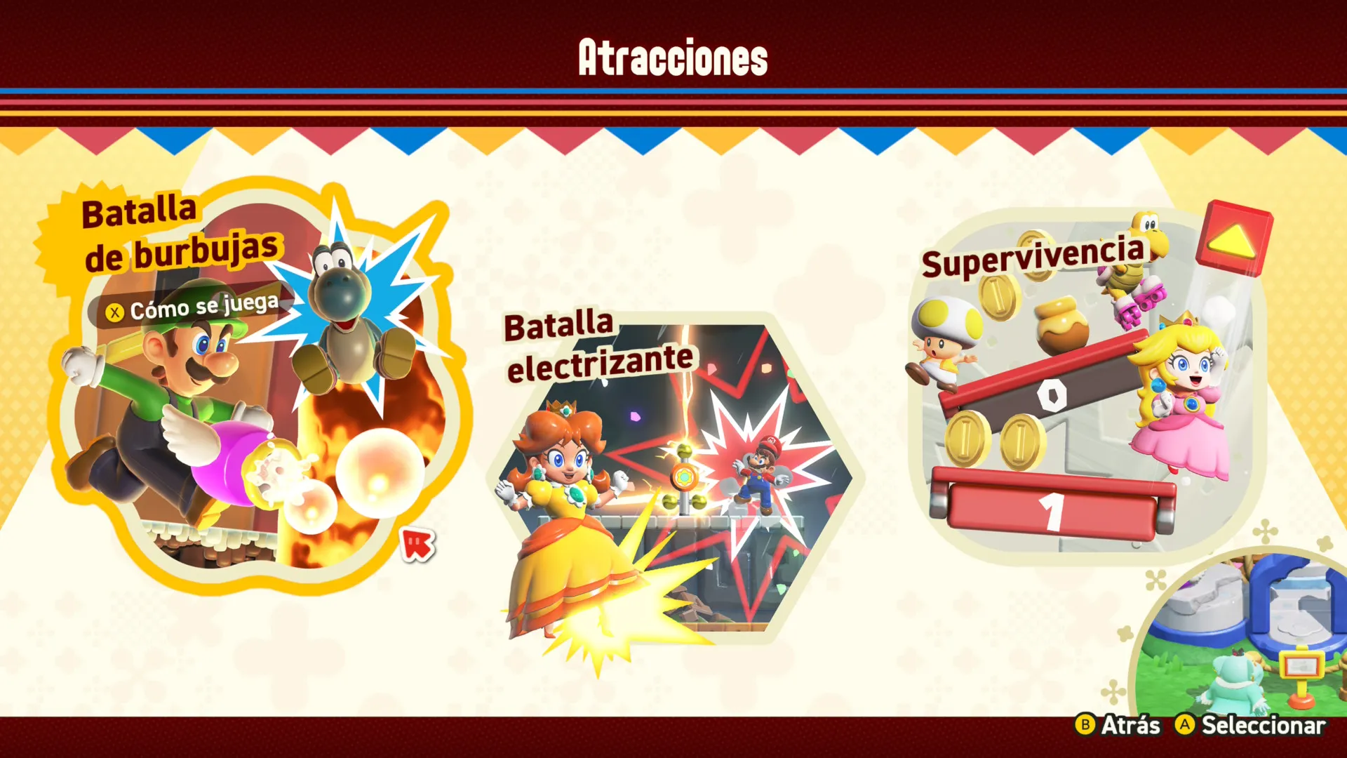 La plaza está dividida en varias zonas, clasificando los minijuegos y haciendo más fácil su búsqueda. Para empezar, tendremos los modos cooperativos y competitivos y por otro las carreras. Mientras que en los dos primeros podremos jugar hasta 4 jugadores, todos ellos de forma local y/o desde un mismo dispositivo, en las carreras es requisito indispensable que cada jugador tenga su propia consola Switch 2 y su copia del juego.