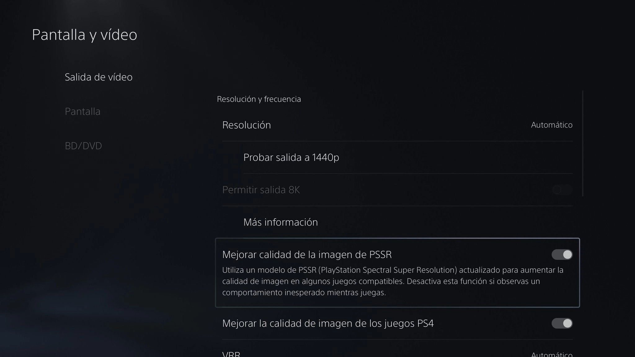 4. «Mejorar calidad de la imagen de PSSR: en Ajustes > Pantalla y vídeo > Salida de vídeo, activa esta opción, para los juegos que aún no tenga el parche 2.0 del PSSR, tengan una mejora automática, tanto de frames por segundo como de artefactos.