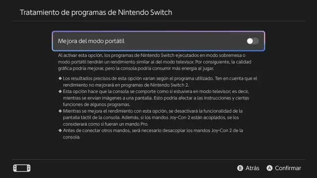 La clave de este nuevo firmware es la gestión de la potencia. Hasta ahora, Switch 2 ejecutaba los juegos antiguos de forma conservadora para ahorrar batería. Con el nuevo «Modo Portátil Mejorado», la consola desbloquea sus frecuencias de reloj y aplica un filtrado de texturas superior.
