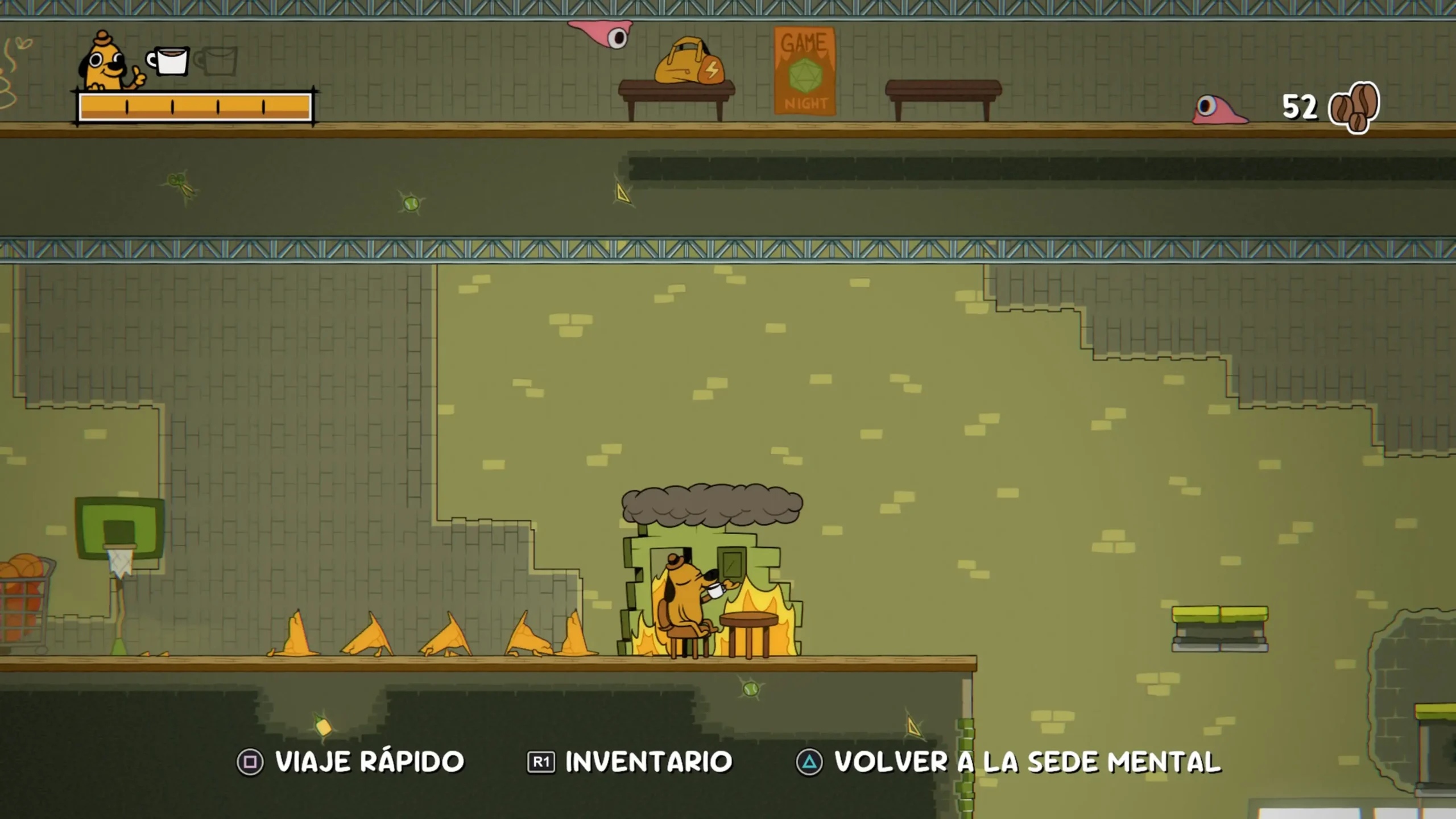La narrativa de Maximum Cope no se pierde en rodeos ni en diálogos infinitos. Nos sitúa directamente en un parque temático cerebral en ruinas donde cada zona es un reflejo de los miedos y ansiedades de Question Hound (el «prota» que controlamos). Lo que nos ha parecido fascinante es cómo el juego utiliza la metáfora del entorno para hablarnos de salud mental.